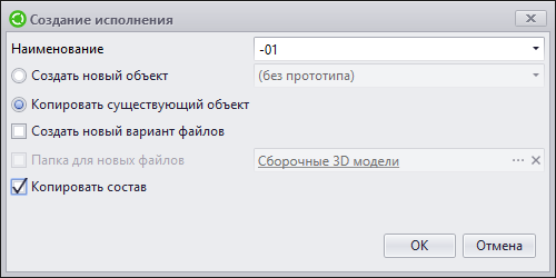 4.А для нового объекта типа "Деталь" будет создана копия файла 3D-модели базового исполнения с добавлением к имени файла суффикса (-01).