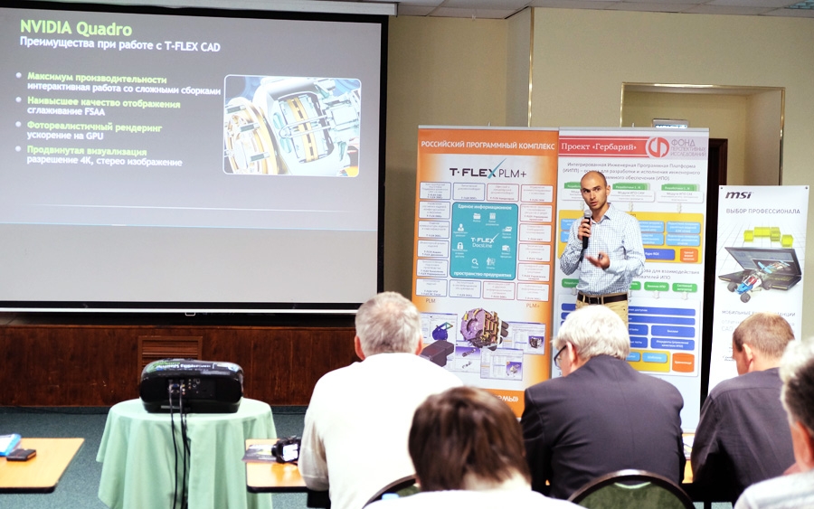 В продолжение темы использования тонкого клиента при работе с графическими системами слово взял Илья Овчинников, директор департамента продаж решений компании «Открытые Технологии». Илья продолжил доклад предыдущего спикера на тему механизма виртуализации рабочих столов при работе в T-FLEX CAD. Все желающие смогли опробовать их в действии на развёрнутом демонстрационном стенде компании.