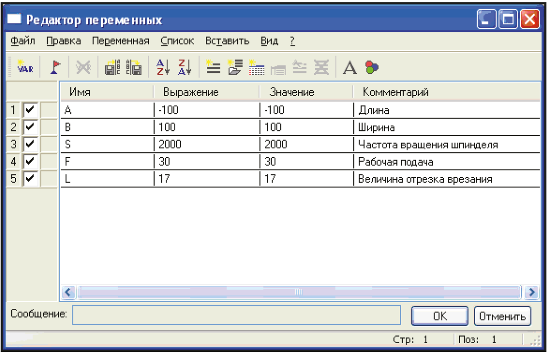 Основным новшеством T-FLEX ЧПУ 10, несомненно, является параметризация. Так, пользователь, наряду с параметрами T-FLEX CAD, может назначить символьное обозначение (переменную) для любого технологического параметра T-FLEX ЧПУ. Например, параметры «Величина рабочей подачи», «Частота вращения шпинделя» или «Длина отрезка врезания» могут быть заданы переменными «F», «S» и «L» соответственно и изменяться в одном диалоговом окне для всей обработки (рис. 1).