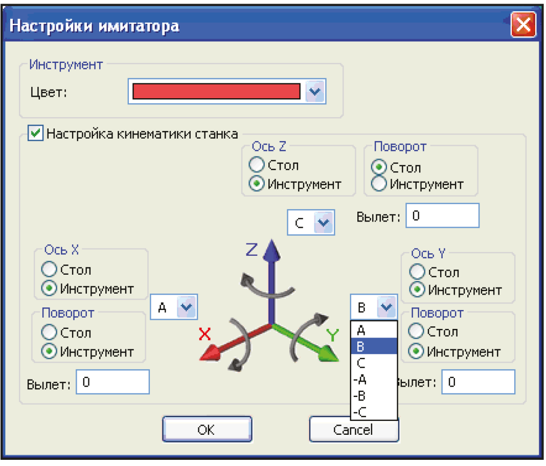 Существенно расширены возможности имитатора в области отображения кинематики станка. В новой версии системы пользователь самостоятельно определяет те оси, перемещения и повороты которых при имитации обеспечиваются не перемещениями инструмента, а перемещениями стола станка (рис. 3). Можно сказать, что встроенный имитатор стал более гибким, более реалистичным и более функциональным.