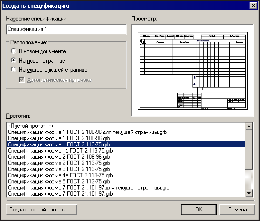 Создание спецификации происходит на основе прототипа, определяющего состав таблицы и правила форматирования ее содержимого. Пользователю остается только выбрать нужный прототип.