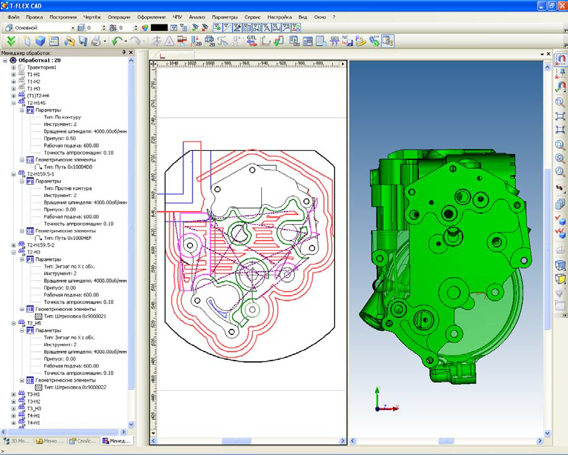 Большую роль в редактировании файлов с обработками играет удобный и уже полюбившийся пользователям программный инструмент «Менеджер обработок». В нем все траектории, составляющие один технологический установ, группируются и представляются при помощи структуры дерева обработки. Такая структура дает пользователю четкое представление о последовательности операций в обработке, позволяет быстро просмотреть основные параметры траекторий обработки и геометрические элементы чертежа или модели, которые лежат в основе просматриваемой траектории. «Менеджер обработок» также обеспе-чивает возможность быстрого изменения существующих траекторий, их копирования, быстрого создания множественных массивов траекторий и т.д. Среди его возможностей также изменение однотипных параметров для группы траекторий. Таким образом, пользователь может выбрать интересующую его группу уже созданных им траекторий обработки и вызвать команду изменения общих параметров. После этого система T-FLEX ЧПУ самостоятельно проанализирует выбранные траектории на наличие общих параметров и выведет все общие параметры этих траекторий обработки в отдельном диалоговом окне. Аналогично может происходить и задание подводов и отводов инструмента, а также особых движений врезания в материал для группы траекторий. Например, можно установить один инструмент для группы траекторий или одинаковые режимы резания, одинаковые типы проходов, способ и факт подачи СОЖ при обработке и многое другое. Большинство из вышеописанных возможностей активно использовались специалистами технологического отдела НПП «ЭГА» при создании управляющих программ для обработки корпусной детали.