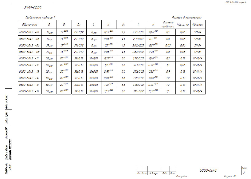 - таблицу переменных данных, содержащую обозначение каждого варианта исполнения и конкретное значение переменных параметров, отличающих варианты исполнения (например, размеров, допусков, шероховатостей, материалов, покрытий, массы и т.д.).
