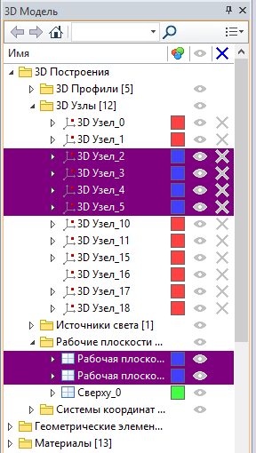 Окно отображает выбор объектов модели синхронно с основным пользовательским интерфейсом системы. Это позволяет выбирать нужные объекты для редактирования и задания связей между объектами модели аналогично тому, как это делается в окне структуры 3D модели.