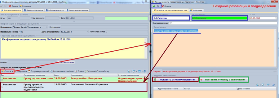 После рассмотрения документа руководством и в соответствии с резолюцией, он отправляется в подразделение-исполнитель, где его принимает сотрудник, ответственный за делопроизводство подразделения.