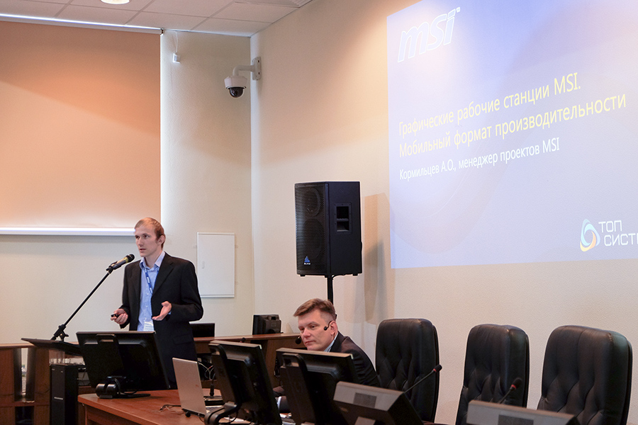 После перерыва доклад на тему «Графические рабочие станции MSI» сделал Артем Кормильцев, представитель компании MSI. Компания MSI — один из ведущих производителей и лидер в области инновационных решений на рынке игровых продуктов, а также мобильных рабочих станций. Артем представил гостям мощнейшие рабочие инструменты для 2D- и 3D-моделирования.