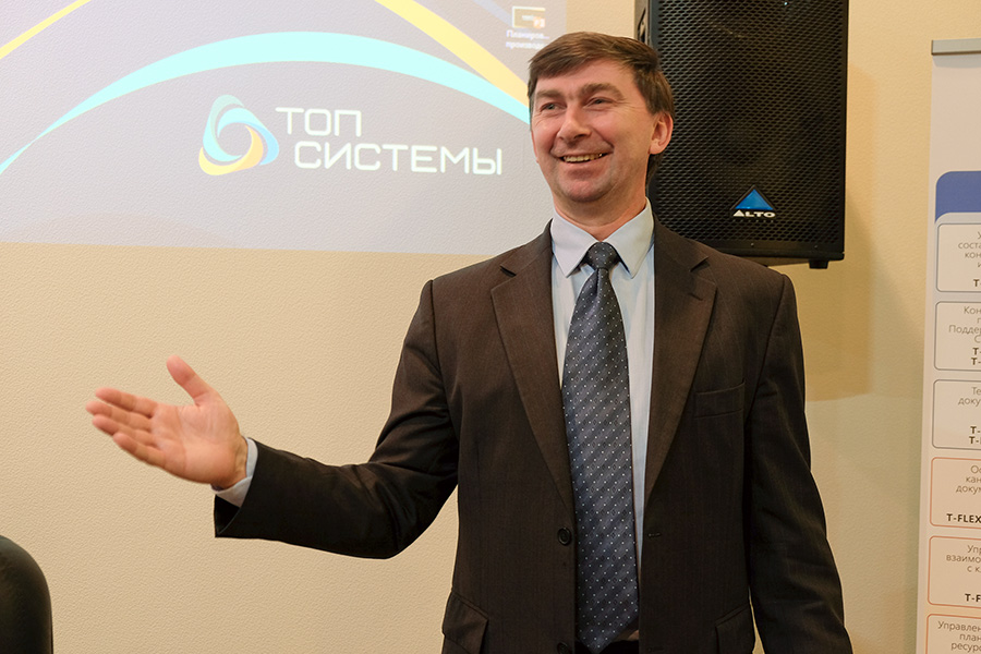 Традиционно с первым докладом выступил генеральный директор компании «Топ Системы» Сергей Кураксин. Поприветствовав гостей, Сергей в тандеме с Игорем Кочаном, директором по маркетингу, представил слушателям доклад о компании «Топ Системы», решениях и подходах к внедрению систем комплекса T-FLEX PLM на предприятиях.