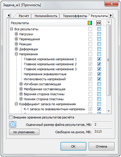 В связи с этими изменениями, работа диалога запуска на расчет в новой версии системы несколько изменена. После настройки всех необходимых опций расчета и нажатия кнопки Далее, появляется специальный диалог, позволяющий выбрать рассчитываемые и сохраняемые результаты (рис. 18).