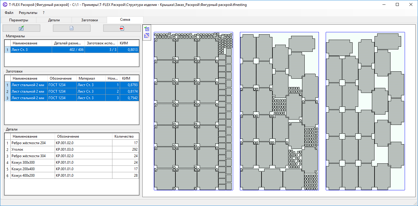 Рис. 14. Результаты оптимизации фигурного раскроя для заказа