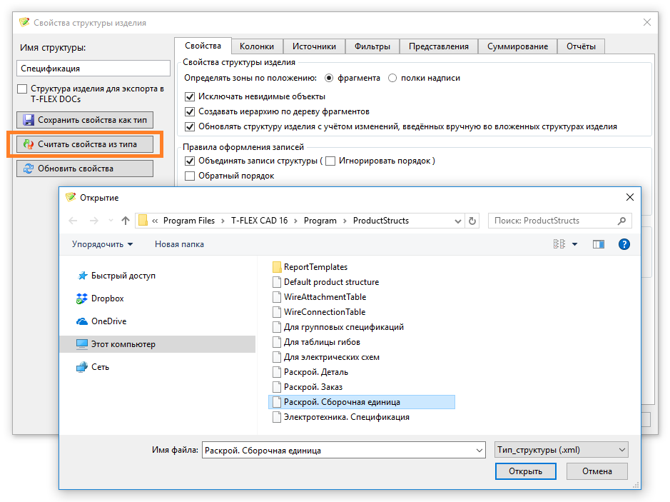 Рис. 4. Считывание типа в диалоге параметров структуры изделия