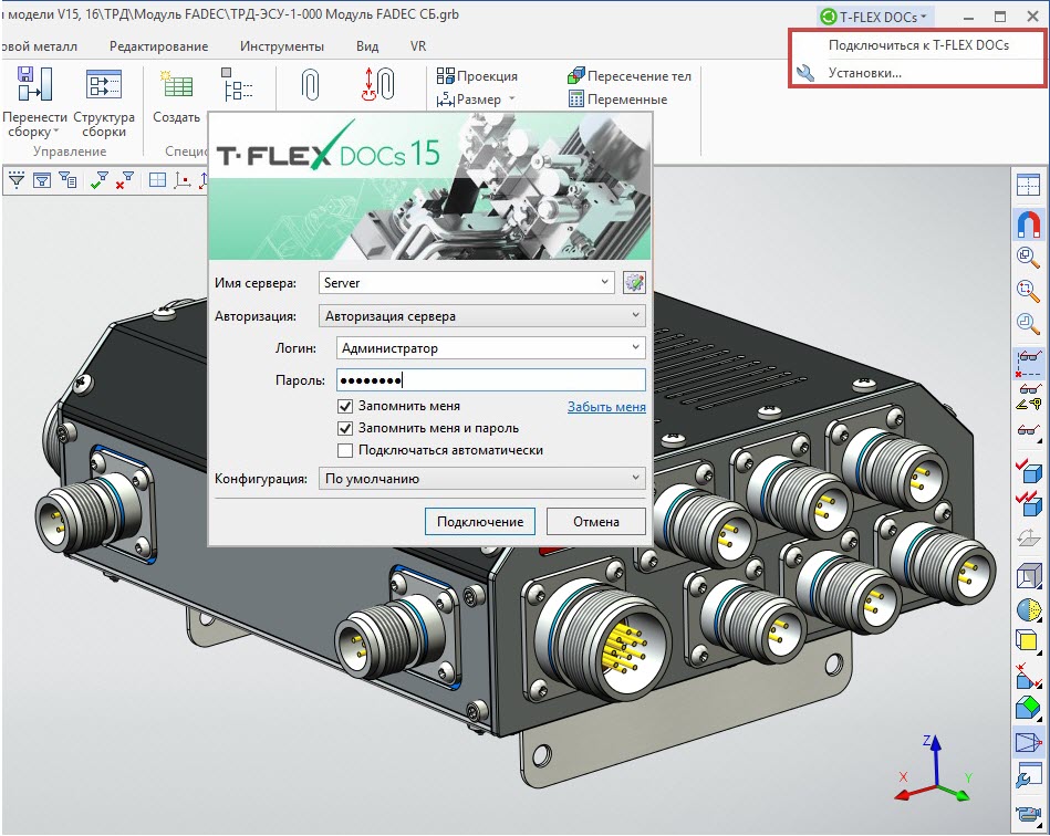 Рис. 3 Подключение окна T-FLEX DOCs в интерфейс T-FLEX CAD