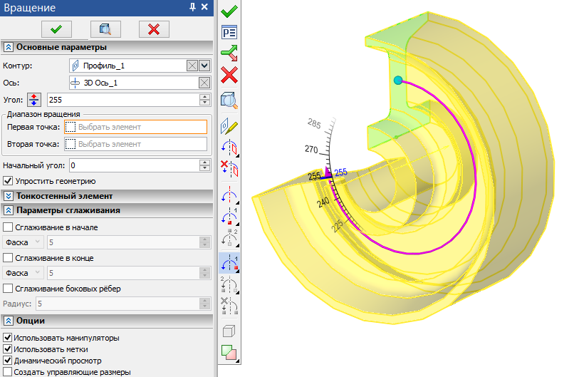 Теперь можно управлять выбранными элементами: контуры, ось и точки, задающие диапазон вращения (Рис. 5). Значительно уменьшено количество кликов при создании операции вращение: