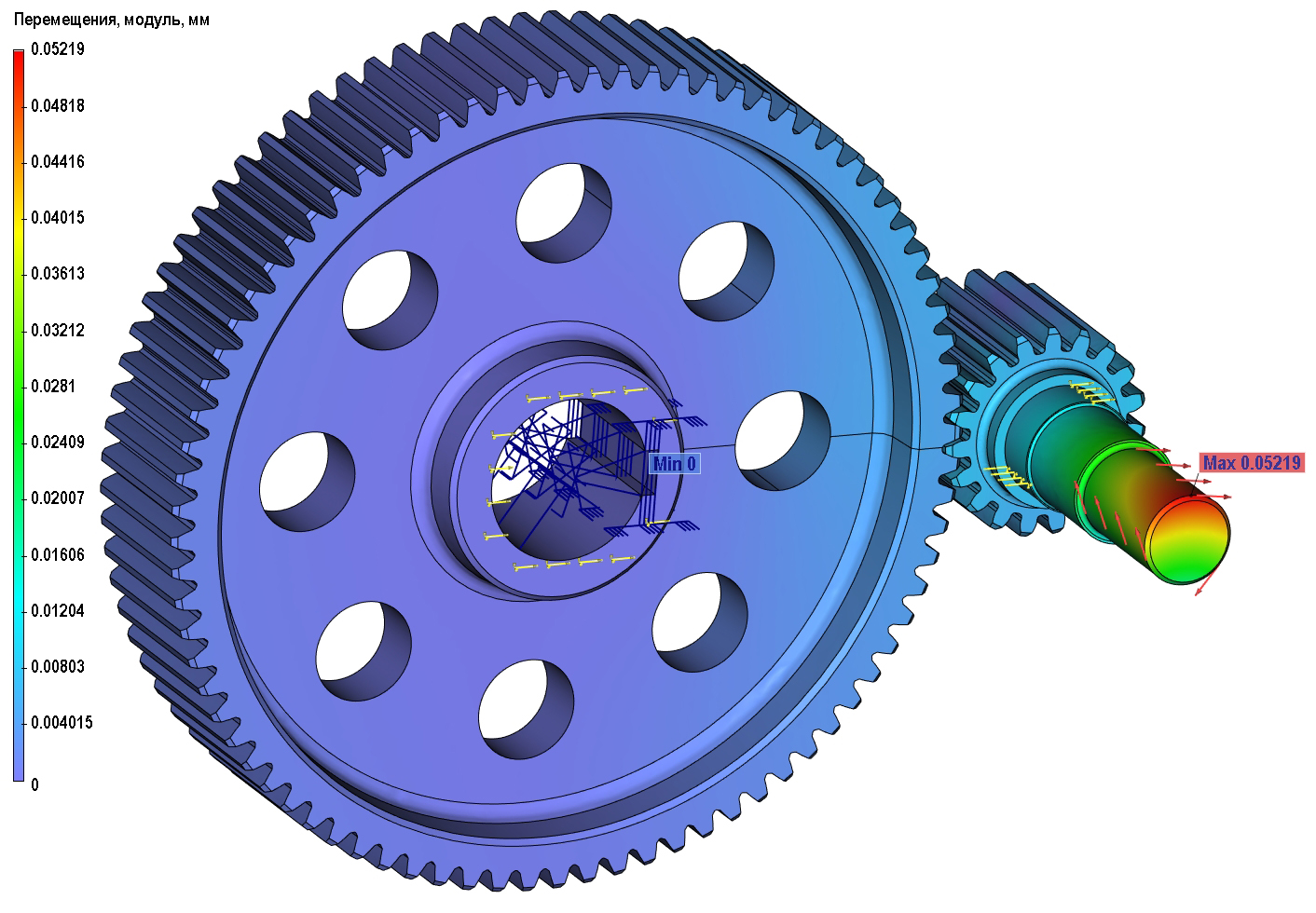 Также оценены перемещения в зацеплении зубчатых колес (рис. 11), максимальные перемещения составили 0,05219 мм.