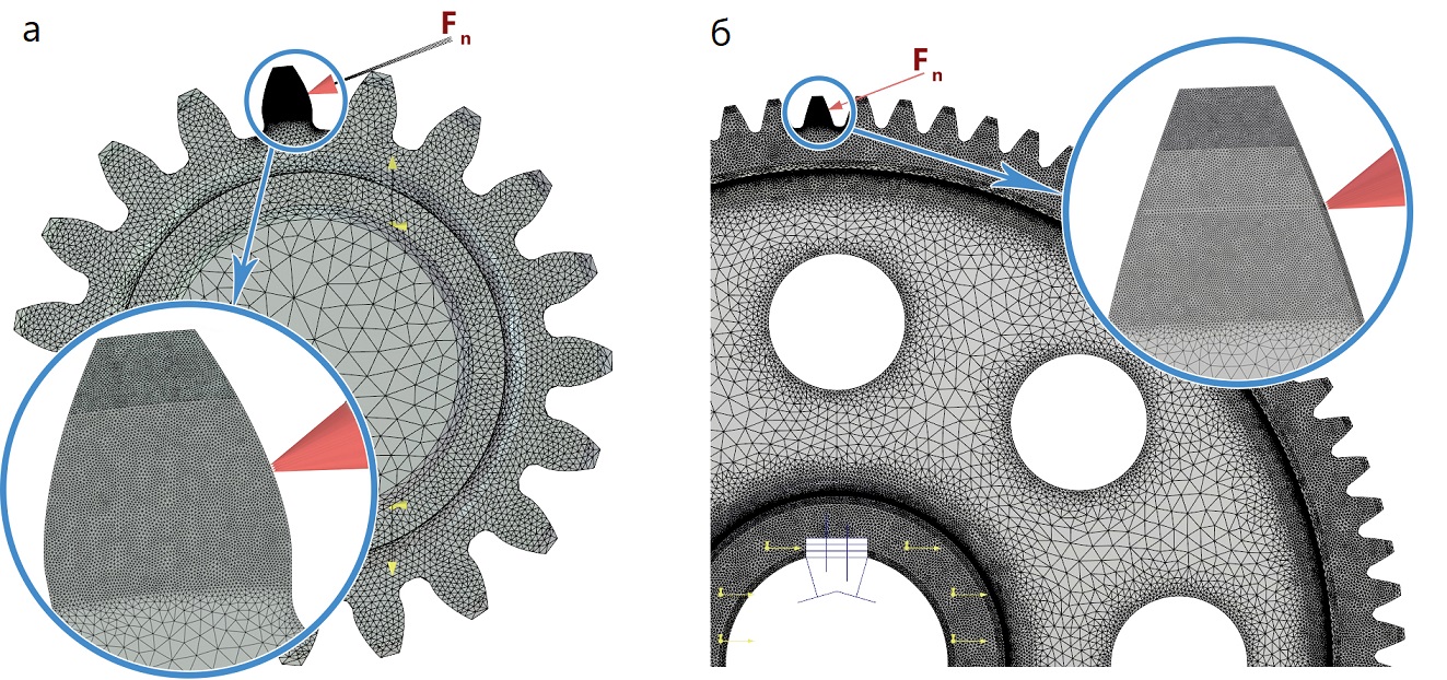 Число объемных конечных элементов: вал-шестерня – 2,66 млн. (рис. 4а); колесо – 7,3 млн. (рис. 4б); контактная задача – 1,05 млн. (рис. 5).