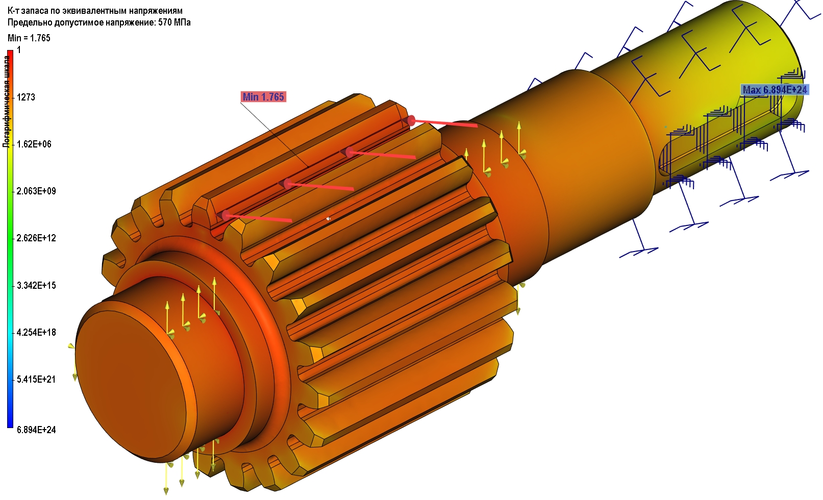 Определен запас статической прочности по эквивалентным напряжениям относительно допускаемых напряжений, то есть напряжений предела текучести для выбранного материала. Получено, что для вала-шестерни запас составил 1,765 (рис. 9), для колеса – 1,792 (рис. 10). Минимально допустимый запас – 1,1.