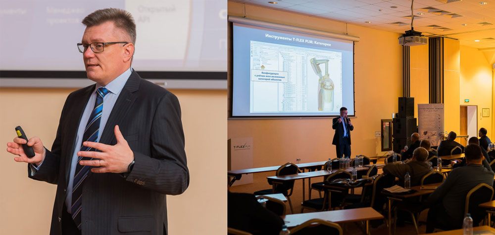 С докладом о комплексе T-FLEX PLM, планах по развитию систем, а также о текущих задачах, которые ставят заказчики перед компанией «Топ Системы», выступили Сергей Кураксин, генеральный директор компании «Топ Системы», и Игорь Кочан, заместитель генерального директора по развитию PLM-технологий компании «Топ Системы».