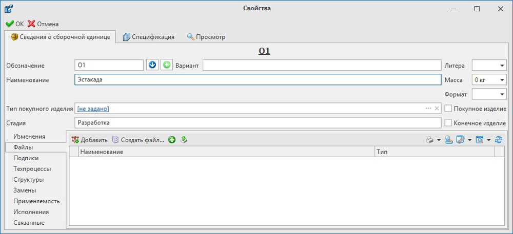 Рис. 5. Свойства объекта Сборочная единица (без прототипа)