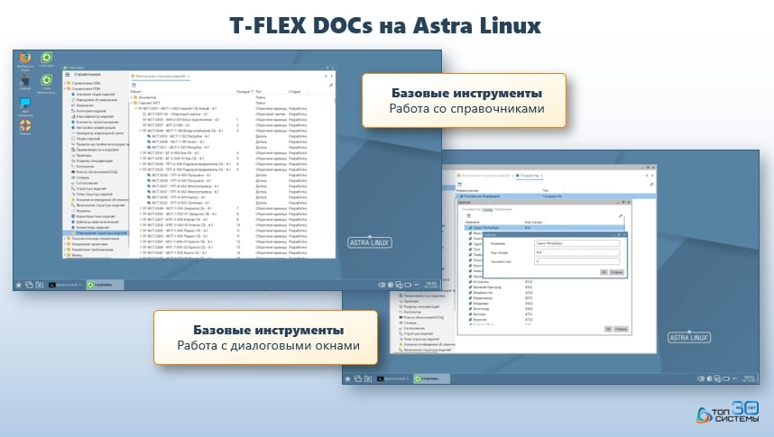 Директор по разработке компании «Топ Системы» Сергей Козлов при участии руководителя разработки T‑FLEX DOCs Андрея Жигарева продемонстрировал новейшие разработки в области кроссплатформенного интерфейса системы T‑FLEX DOCs в операционной системе Linux без использования каких-либо эмуляторов и виртуальных сред. Участники конференции «вживую» увидели работу Т-FLEX DOCs непосредственно в среде Astra Linux. Кроме того, в ходе демонстрации были показаны «чудеса» единого кроссплатформенного решения – сначала в клиенте T‑FLEX DOCs под Linux было создано несколько объектов, потом они были открыты и модифицированы клиентом T‑FLEX DOCs под Windows, а затем отображены и снова изменены через интерфейс системы T‑FLEX DOCs под WEB. При этом все три клиентских приложения одновременно работали с одним и тем же сервером платформы T‑FLEX PLM, функционирующим под управлением операционной системы Astra Linux. Подобная прозрачность и универсальность демонстрировалась впервые и на момент публикации была и остаётся уникальным российским решением для задач PLM.