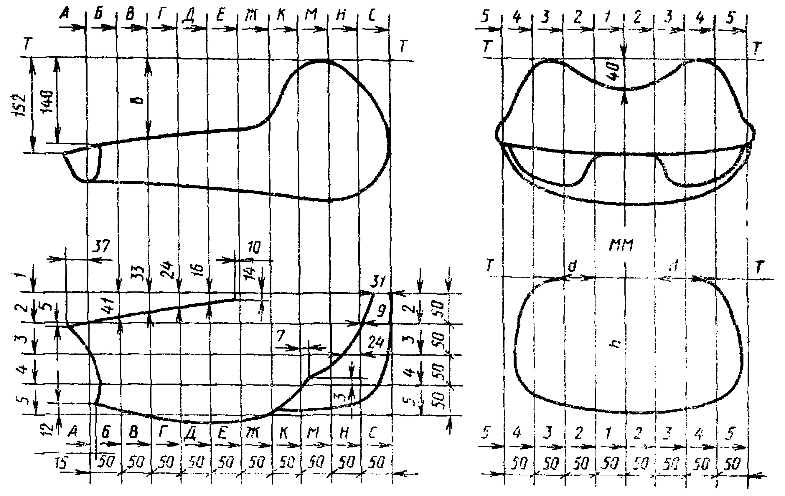 Рис. 28. Основные проекции каркаса поверхности седалищной панели