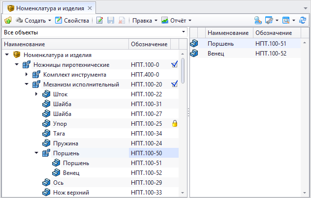 3.Дерево со списком – поддерживается всеми справочниками и совмещает в себе два предыдущих режима. В этом случае рабочее окно разделено на две части. В дереве слева отображаются объекты только тех типов, в которые могут входить другие объекты. При выборе в дереве какого-либо объекта в правой части открывается список его дочерних объектов первого уровня вхождения.