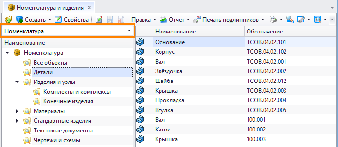 Номенклатурный справочник включает в себя как материальные объекты (заготовки, детали, сборочные единицы, стандартные изделия), так и документы (чертежи, ведомости, паспорта, инструкции, руководства), которые входят в структуру изделий, выпускаемых предприятием.
