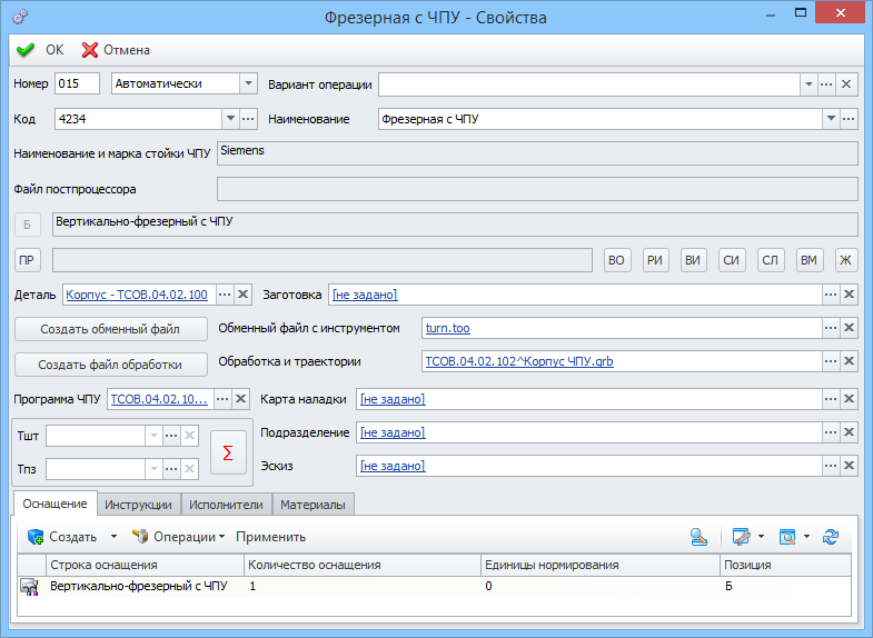 Для каждой технологической операции или перехода выбираются средства технологического оснащения из одноимённого справочника: оборудование, технологическая оснастка, режущий и контрольно-измерительный инструмент.