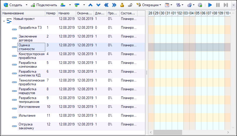 После создания перечня работ можно внести изменения в их свойства, а также с помощью кнопок на панели инструментов редактора проекта: [Переместить вверх] -