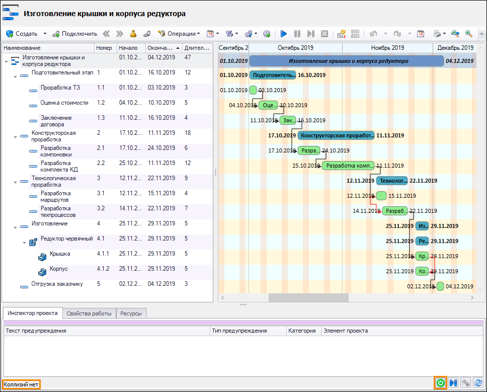 По завершению редактирования плана-графика проекта следует убедиться, что в окне инспектора проекта отсутствуют сообщения о коллизиях.