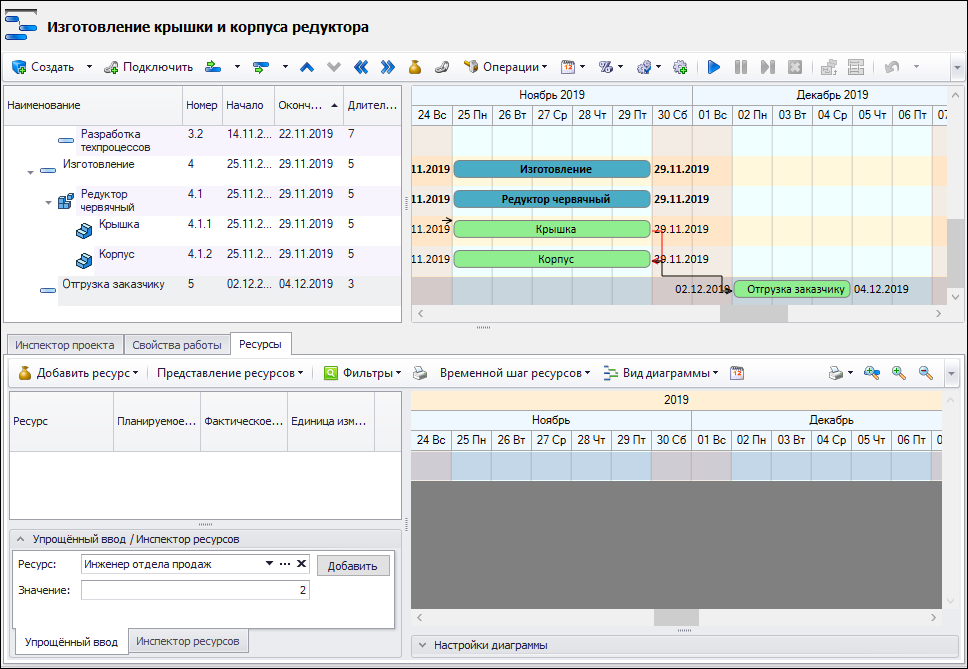 Для быстрого добавления планового значения использования ресурса можно воспользоваться диалогом упрощённого ввода, расположенном в левом нижнем углу вкладки "Ресурсы". При этом, в дереве проекта следует выбрать работу, в которой планируется использование ресурса (например, "Отгрузка заказчику"), а в диалоге упрощённого ввода ресурсов указать наименование ресурса из справочника "Ресурсы" (например, "Инженер отдела продаж") и значение его загруженности или количества (например, 2 часа).