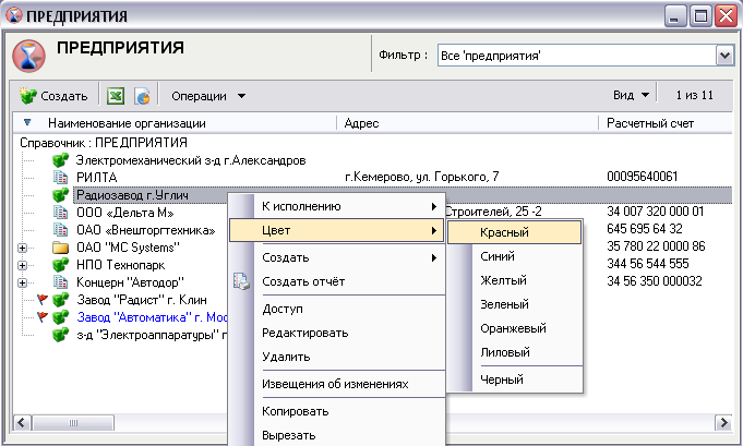 Поддержка справочником выделения объектов флагами позволяет помечать объекты флагами определенных цветов.